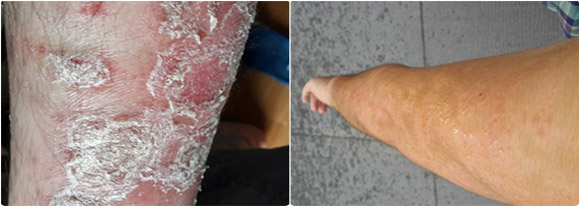 病情:三年病史,手臂和腿上均有皮损,顽固型牛皮癣,反反复作